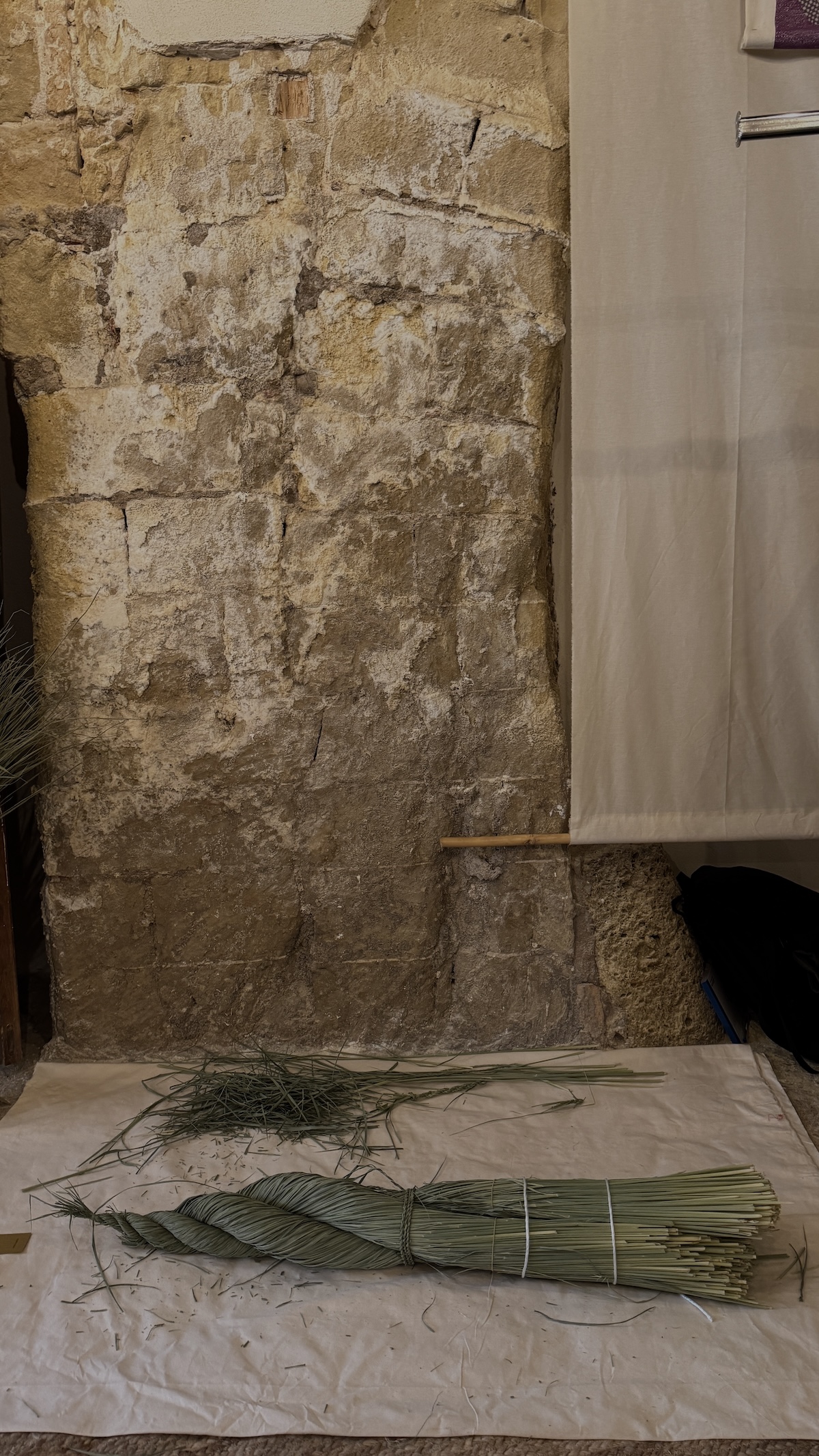 Eri works with Shimenawa (Sacred straw ropes) and Sekimori stones, and creates scenography that translates ancient culture into the modern age. [Shimenawa are stylized ropes made of twisted rice straw and hemp, holding significant cultural and spiritual importance in Japan, particularly within the Shinto religion. They are used to demarcate sacred spaces, ward off evil spirits, and symbolize purification ] We started the workshop with a short Zazen (座禅) Buddhist meditation after which Eri, with the help of a translator introduced the history and cultural significance of Shimenawa with us.