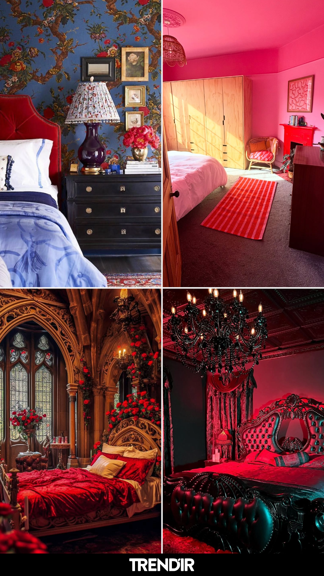 If drama had a bedroom, this would be it. Deep crimson walls, ornate mirrors, and low lighting create a space that feels theatrical and unapologetically bold.