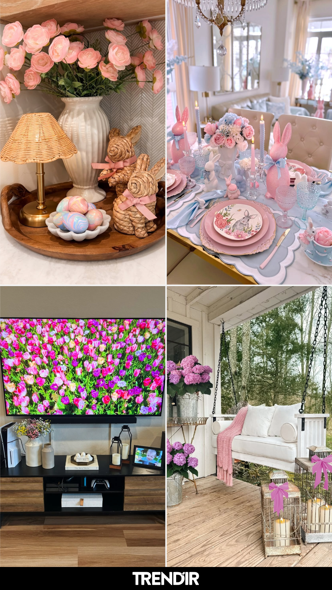This little corner tells a full story without trying too hard. A soft pink floral arrangement, woven bunnies tied with ribbons, and a dish of marbled eggs come together like a gentle nod to Easter mornings.
