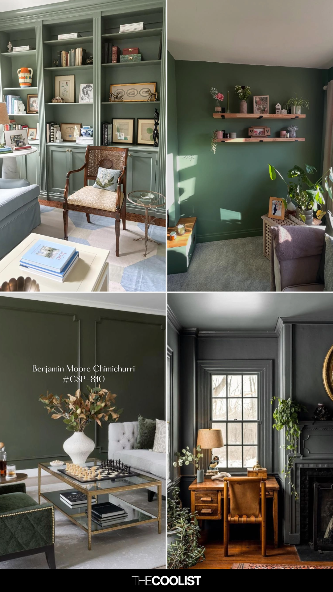 If rich olive green walls and velvet detailing had a lovechild—it’d be this room. @sho.and.co leans into the drama with Benjamin Moore’s Chimichurri (#CSP-810), a hue that’s sophisticated, saturated, and absolutely scene-stealing.