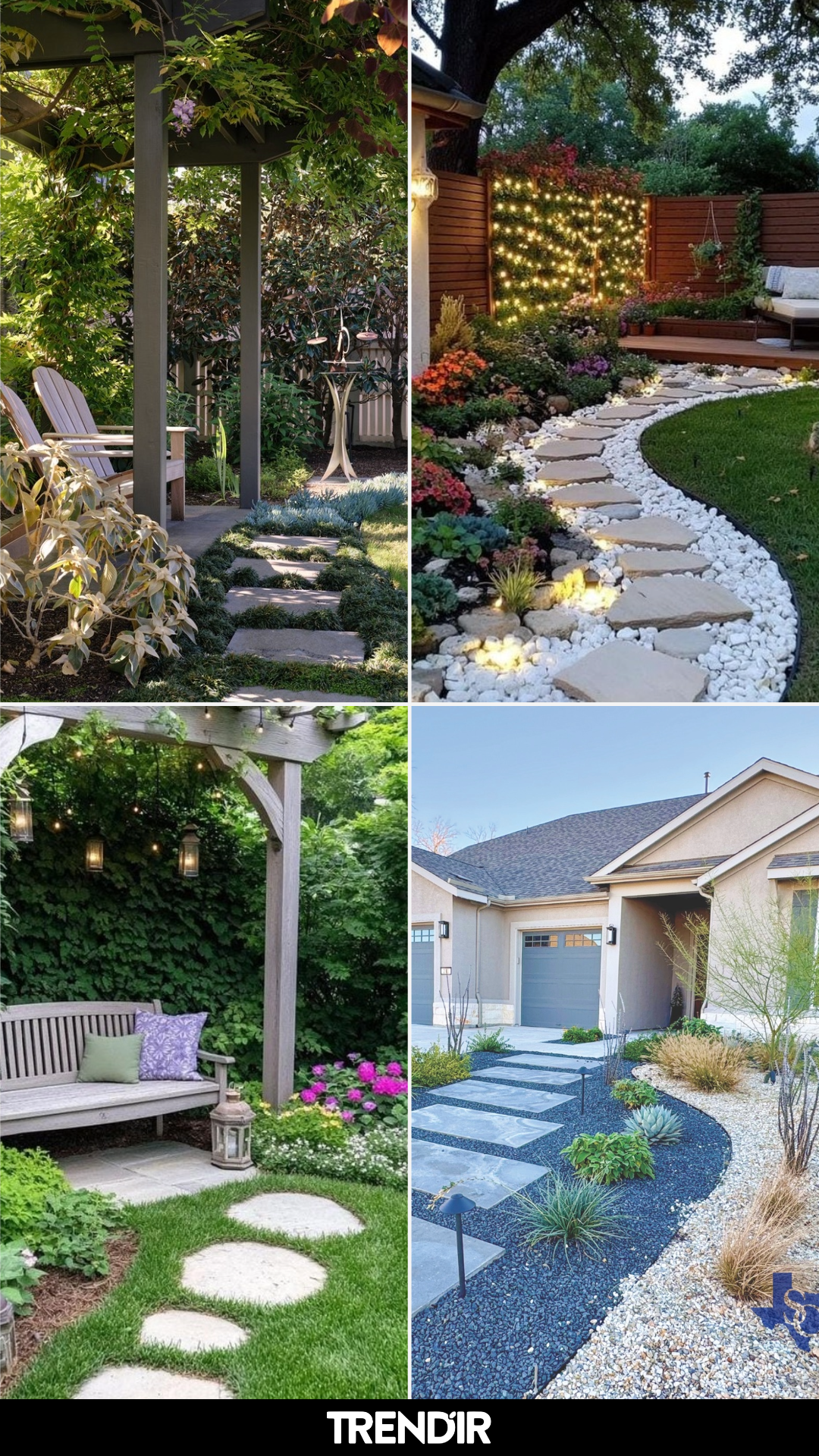This one feels like stepping into a summer evening that lingers just a little longer. Soft string lights drape across the branches, casting a warm glow over a winding stone path lined with bright, cheerful blooms.
