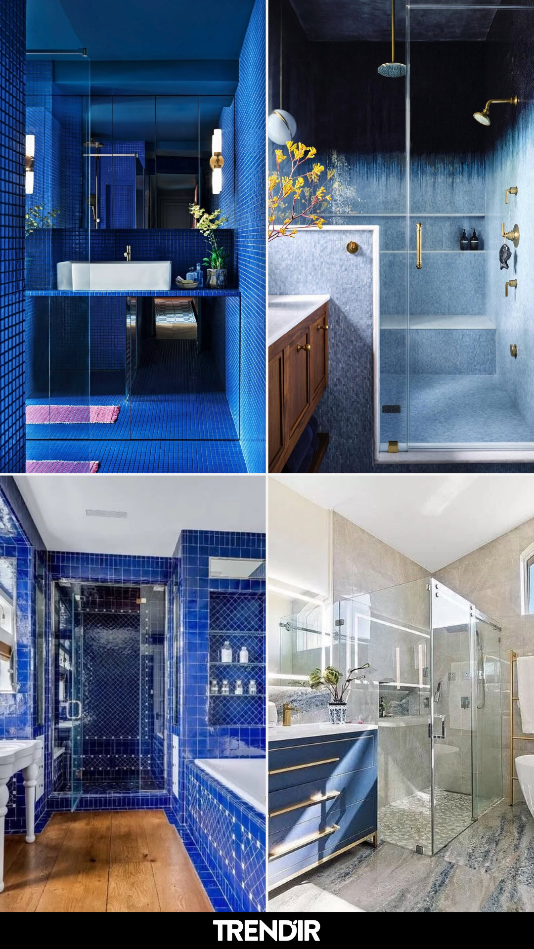Moody, modern, and just a little bit wild—this bathroom pulls zero punches. The deep sapphire tile wraps the entire space in a rich, cocoon-like glow. It’s bold, it’s graphic, and it makes no apologies.