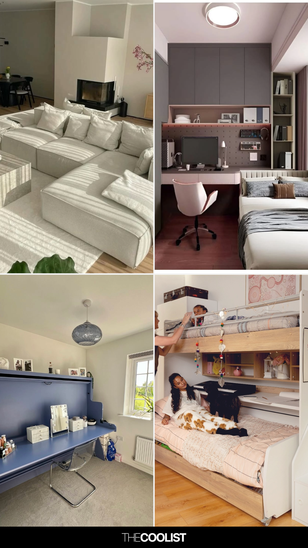 Three beds, one footprint, zero clutter. This genius bunk stack hides a pull-out trundle and folds in a full desk space too — and somehow still leaves room for personality. The stairs double as drawers, the shelves feel like mini stage sets, and every child has their own space to sprawl.