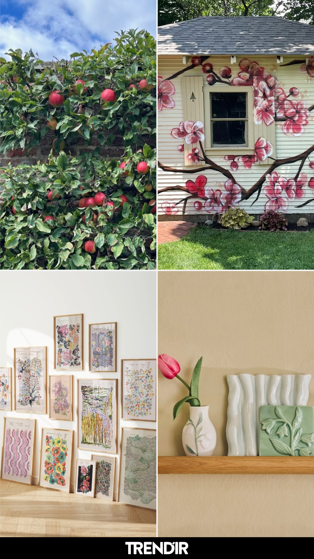 Sometimes the best wall decor isn’t decor at all. Climbing apple branches spilling over a brick wall create a layered, organic look that no store-bought piece could replicate.