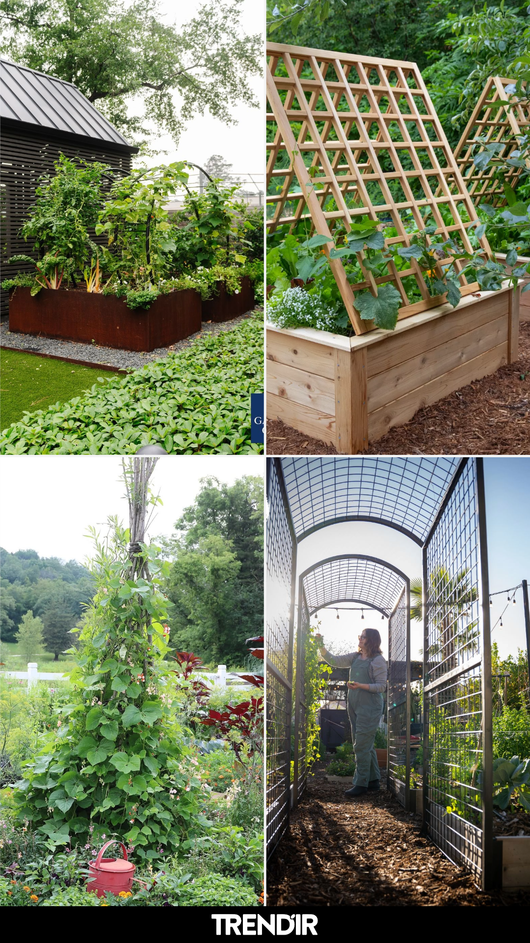 This one leans into structure in the best way. Clean wooden frames, neat grid lines, and climbing plants that fill in over time create a look that feels organized but never rigid.